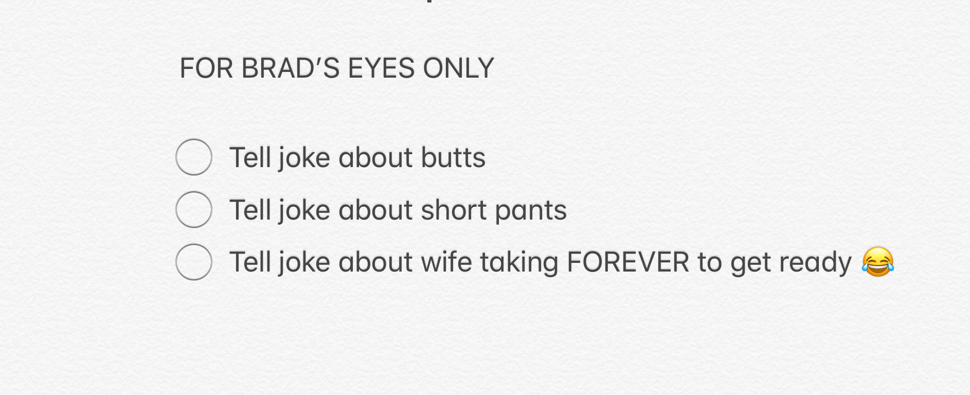 Before Brad embarked on his tour, he went home to practice his material on Victoria, but she was, of course, a new mom and hadn’t slept in days.